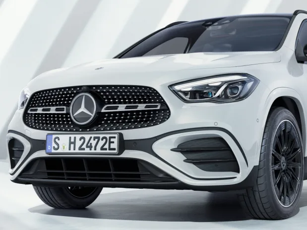 Предниот дел на GLA со дијамантска решетка на ладилникот со хромирани иглички и MULTIBEAM LED предни светла[1] не само што го нагласуваат неговиот спортски фокус, туку обезбедуваат и поголема безбедност. Контролираните LED-светла реагираат флексибилно на различни сообраќајни ситуации. Светлата за свијоци, исто така, го осветлуваат вашето видно поле на најдобар можен начин.