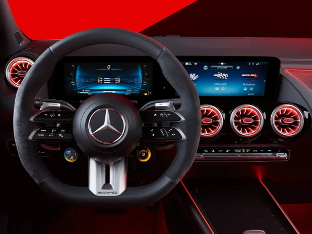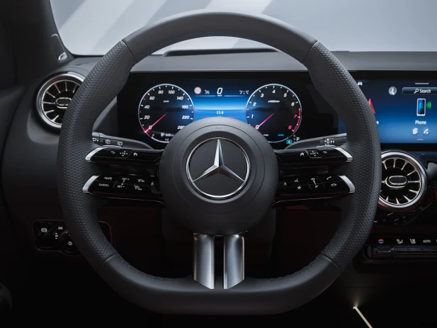 Уживајте во новото динамично возачко искуство со мултифункционалниот спортски управувач во GLA. Користете ги контролните панели на допир за да управувате со најважните функции на возилото без да ги тргате рацете од управувачот. А и вие не би сакале, бидејќи висококвалитетната напа кожа е уникатно доживување. Мултифункционалниот спортски управувач е достапен и во вештачка кожа ARTICO[1], што ја истакнува прогресивната природа на вашето возило.