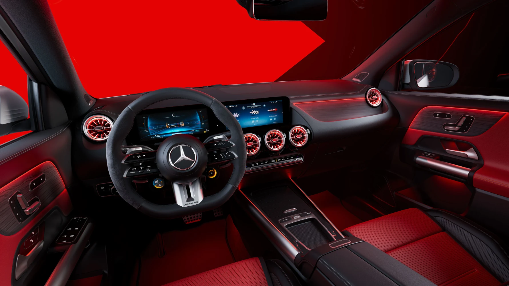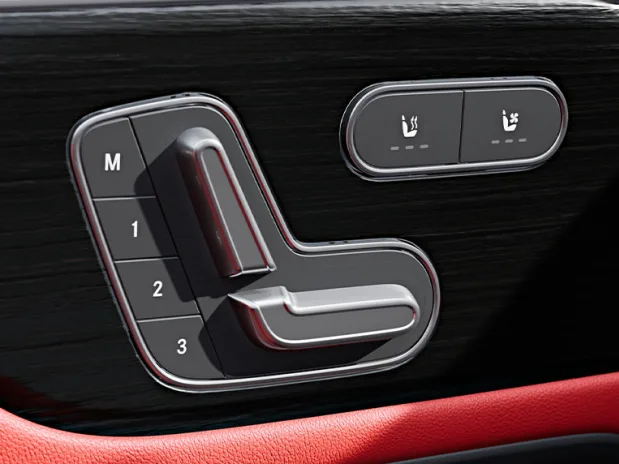 AMG Performance седиштата[1] ви обезбедуваат идеална странична поддршка, дури и кога изведувате динамични маневри за возење. Стандардните спортски седишта ви овозможуваат и дополнителни приспособувања користејќи ја функцијата на интегрираните седишта со грејачи. Можете електрично да ја приспособите точната положба на седиштето. Седиштата може да се нарачаат во црвена/црна боја.