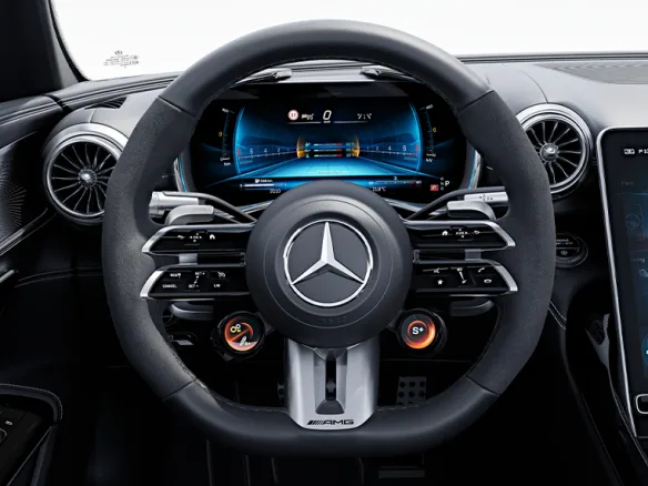Со стандардните AMG-копчиња на управувачот, истиот станува исклучително спортски: тие овозможуваат брзо и непогрешливо ракување со одредени динамични функции на возење.
