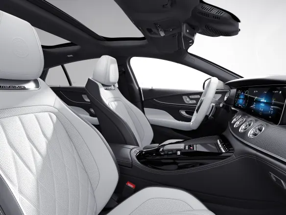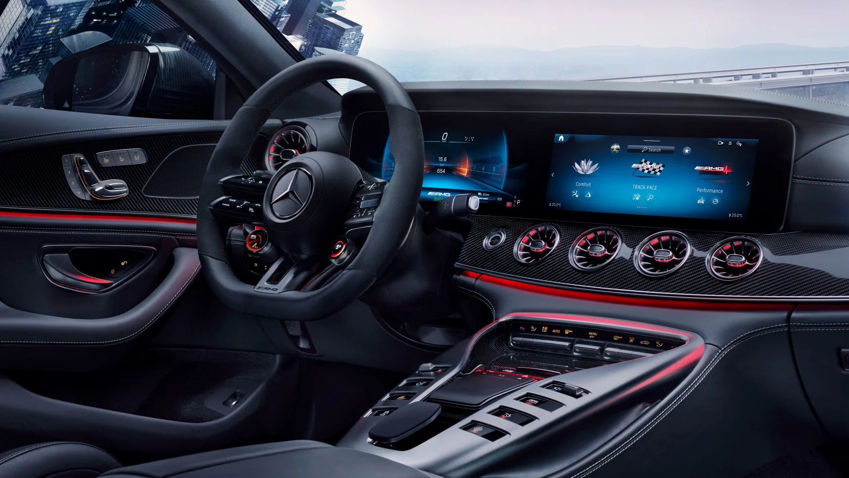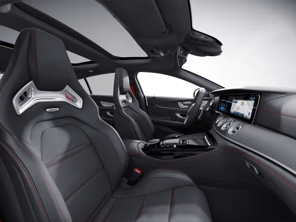 Моделот Mercedes-AMG GT со 4 врати нуди повеќе простор и поголема корисна вредност. Совршено чувство за мотоспорт со удобност на оригинален салон. Индивидуалните пакети на опрема го заокружуваат ентериерот. Пилотската кабина импресионира со исклучително квалитетни материјали и одличен квалитет на завршна обработка. Ексклузивниот AMG-мирис обезбедува дополнителни перформанси за вашите сетила.