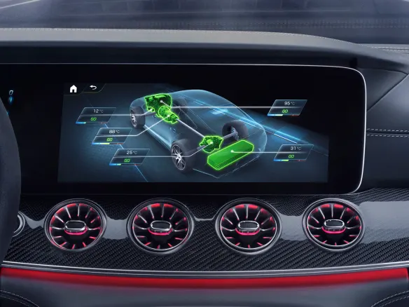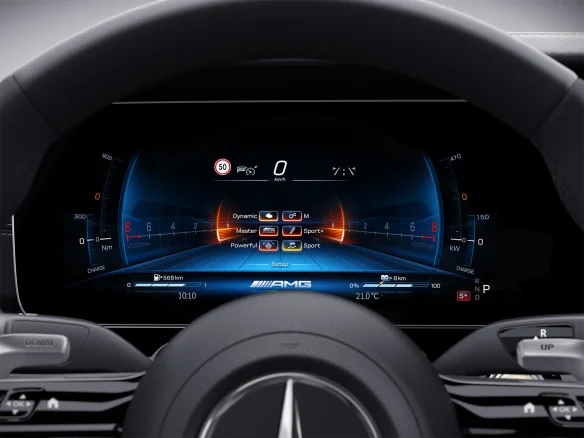 Стандардната пилотска кабина со широк екран го содржи мултимедијалниот систем MBUX со интегрирани AMG хибридни екрани и функции. На инструмент-таблата можете да го видите електричниот опсег, потрошувачката на енергија, излезот и вртежниот момент на сите енергетски единици, како и температурите на сите релевантни компоненти, директно пред вас во секое време.