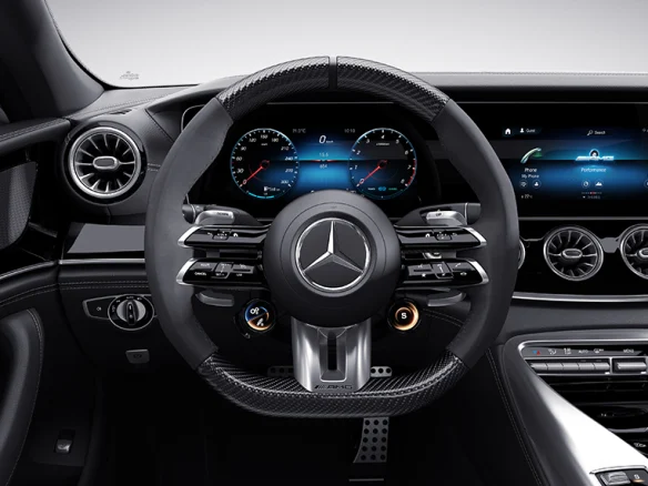 На овој AMG-управувач, впечатливиот дизајн од карбонски влакна е комбиниран со MICROCUT микрофибер обезбедувајќи добар стисок – визуелен и тактилен белег. Карактеристичната AMG зарамнета форма е усвоена од мотоспортот и го нагласува спортскиот карактер на пилотската кабина. Ергономски позиционираните контролни табли на допир обезбедуваат интуитивна прифатливост за корисникот и се погодни за фокусирано возење.
